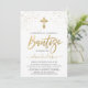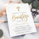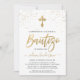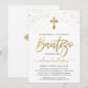 Bautizo, garoto moderno e elegante, Convite com fundo branco e ouro, elegante cruz de ouro, script de tipografia Baptism em letra de tendência. Para editar este modelo, clique em personalizar mais.