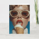 Um grande e retrorinspirado close-up de uma mulher glamourosa em óculos escuros de tamanho excessivo desfrutando de um cone de sorvete cremoso sob o sol. A imagem apresenta um batom vermelho ousado, pele sem defeitos e um suéter de malha em waffle na moda, incorporando moda antiga com uma reviravolta moderna.