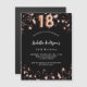 Um fundo preto clássico, decorado com estrelas douradas rosa. Personalize e adicione um nome e detalhes da parte. O número 18 é escrito com um script de estilo de balão.