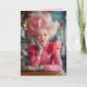 Um retrato espantoso de uma idosa elegante, com um estilo de cabelo rosado extravagante e um traje de convivência, exuberando confiança e charme. Sua composição vibrante e seus acessórios detalhados, incluindo broches em forma de coração, evocam temas de amor e paixão. Com um sutil festeiro de seus lábios, ela parece soprar um beijo delicado, adicionando um toque de romance ao confortável fundo do café.