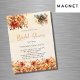 Um fundo branco na moda e ouro de cor d'água. Decorado com uma abelha e flores amarelas e laranja. Com o texto: Chá de panela escrito com um moderno estilo escrito à mão. Personalize e adicione o nome da noiva à abelha. Ouro e letras pretas.