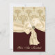 Convite elegante do jantar de ensaio do casamento, feito no marrom escuro, no branco, e nas cores de tom de creme. Gráficos de um tan bonito no damasco de creme do teste padrão do trigo, na parte superior, e marrom escuro contínuo, na parte inferior, do convite, com creme bonito uma fita e um arco coloridos, através do meio. Você é convidado, no texto amarelo pálido do roteiro, na parte dianteira do convite, e todo o texto, na parte traseira, é inteiramente customizável serir suas necessidades do evento. Convite que bonito o casal estimará, com todas suas lembranças do casamento.