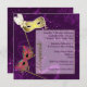 O convite de festas elegante da bola/carnaval de mascarada feito em um roxo rico, com os gráficos dos redemoinhos e a faísca gostam do design, no fundo. Os gráficos de duas máscaraes protectoras ornamentado decoram o lado esquerdo do convite e o mascarada gráfico goldtone da leitura do texto é colocado no lado esquerdo da área de texto. O texto no roxo escuro é inteiramente customizável para que você personalize para seu evento. Excelente para partidos, Dia das Bruxas, carnaval, e carnaval do mascarada.