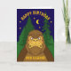 Diversão do cartão de aniversário do Bigfoot com um sorriso na floresta noturna. Diz: "Feliz Aniversário, Sua Legenda!" Todo o texto na frente e no dentro é personalizável para que você também possa usar este cartão para graduações ou aposentações etc