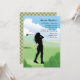 Convide amigos a tee fora com este convite bonito, golfe-temático. É perfeito para uma fêmea, celebração do aniversário dos golfe-entusiastas. Caracteriza um de cabelos compridos, fêmea, silhueta no verde com um clube de golfe em suas mãos sob um céu azul com as nuvens billowy, brancas. O cartão é fácil de personalizar com seus fraseio, pia batismal, cor da pia batismal e escolha de seis tipos de papel.