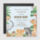 Um belo e divertido primeiro convite de Aniversário, em aquarela, representando uma selva tropical selvagem, completa com uma coleção de animais selvagens fofos. Este tema apresenta animais selvagens e aves como elefante, chita, girafa, zebra, macaco, tucano e avestruz, moldando o cartão. O cartão apresenta uma tipografia texturizada 'Wild One' personalizada exclusiva. A cor de fundo pode ser personalizada de acordo com a sua necessidade.