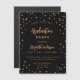 Um cartão de convite glamouroso para uma festa de formatura para ele e para ela. Um fundo preto decorado com estrelas douradas falsas. Personalize e adicione um nome e detalhes da parte. O texto Graduação e o nome são escritos com um script de estilo moderno, escrito à mão. Texto colorido do ouro.