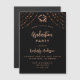 Um fundo preto decorado com estrelas douradas rosa e um boné. Personalize e adicione um nome e detalhes da parte. O texto Graduação e o nome são escritos com um script de estilo moderno, escrito à mão.