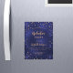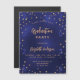 Um cartão de convite glamouroso para uma festa de formatura para ele e para ela. Um fundo azul marinho decorado com estrelas douradas falsas. A cor azul é irregular. Personalize e adicione um nome, ano e detalhes da festa. O texto Graduação e o nome são escritos com um script de estilo moderno, escrito à mão. Texto colorido do ouro.