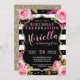 Este Convite Floral Black and White Stripe é completamente personalizável para qualquer evento. Este convite está atualmente configurado para ser um convite de aniversário elegante, com faixas pretas e brancas, sotaques florais cor-de-rosa e detalhes falsos de brilho dourado. Certifique-se de selecionar personalizar mais se quiser usar este para outro evento para acessar o modelo personalizável completo. Este convite é popular para aniversários, chás de panela, festas de solteira e muito mais!