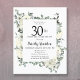 Convite de festas elegante apresenta um quadro botânico de flores brancas e folhas verdes profundas. O nome da pessoa de aniversário é escrito em um texto tradicional. Todo o texto pode ser facilmente editado para criar apenas o tom comemorativo correto.