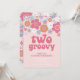 Convite de 2º aniversário inspirado no Retro Groovy! com fontes e cores estilo anos 70, floral em cores rosa e roxo brilhantes.