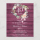 Com uma delicada guirlanda floral de aquarela em um fundo de painéis de madeira rústica vermelha, este convite de aniversário de casamento de 40 anos para uma festa surpresa botânica chique pode ser personalizado com as suas informações especiais de aniversário de rubi. O verso apresenta uma guirlanda floral correspondente emoldurando as datas de aniversário em texto branco elegante em um fundo de madeira vermelha. Criado por Thisisnotme©
