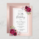Na frente: um fundo rosa dourado cônico não é metálico com uma simples estrutura rosa-dourada e branca. Decorado com flores, rosas em burgundy. Modelos para o seu nome e detalhes da sua festa. O nome e o texto: 50º (ou qualquer idade) Aniversário são escritos com uma escrita à mão, letras cinzas escuras e coloridas. Fundo: rosa dourado falso fundo metálico.
