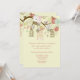Um convite delicioso que caracteriza ramos de árvore de florescência com birdcages de suspensão e um casal doce do pássaro. Entre as flores lá igualmente estão oscilando corações. Apropriado para o bebê ou os múltiplos do género. O cartão é fácil de personalizar com seus fraseio, pia batismal, cor da pia batismal e escolha de seis tipos de papel.