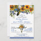 O design de cartão wedding inspirado floral boémio do convite com o crânio da vaca do longhorn da aguarela com penas, os girassóis, as flores selvagens e o guingão azul verificam a beira.