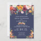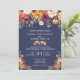 O convite de casamento combina com a nossa coleção de Paprika Burgundy Floral, com uma gota floral de cor d'água de belíssima paleta de burgundy, ouro, coral, blush e lenafy greens que enquadra os detalhes do convite de casamento com um fundo azul marinho. Todo texto é totalmente personalizável.