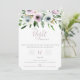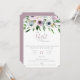 Convite de celebração A Noite Anterior. O cartão apresenta um buquê floral de jardim elegante em tons elegantes de branco, roxo e verde. Design de tipografia moderno e sofisticado. O verso do cartão, mostrado em sombras roxas, pode ser personalizado.