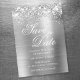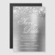 Má brilho prateado com uma ombre metálica de cinza prateada para o seu ímã de casamento. A fonte decorativa "Salvar a Data" é um estilo clássico de caligrafia de rico em conjunto com um estilo de fonte moderno. O brilho feminino reluz e design de folha de impressão de arte digital como uma foto neste ímã.
