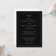 Este convite de casamento elegante apresenta um fundo preto sofisticado com texto branco nítido, criando um contraste marcante que melhora a legibilidade. O layout é centralizado e alinhado verticalmente, exibindo as iniciais "M" e "K" de forma proeminente no topo em uma fonte serifada grande, seguida pelos nomes do casal em letras maiúsculas e negrito conectadas por um "e" em letra cursiva ornamentada. O design emprega fontes serifadas tradicionais ao longo de todo o texto, transmitindo uma estética clássica e atemporal perfeita para celebrações formais. Sua abordagem minimalista concentra-se em linhas limpas e tipografia precisa, exalando um clima de sofisticação e expectativa ideal para eventos importantes da vida, como casamentos.