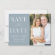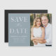 Anuncie sua data de casamento com esta na moda, imã salve a data de fotos moderna. O design apresenta "Salvar a Data" em fontes de script e serif brancas com um fundo azul empoeirado. Personalize a imã salve a data minimalista adicionando seus nomes, data, local do casamento e foto. A simples imã salve a data é perfeita para qualquer tema de casamento.
