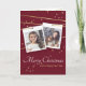 Um cartão de saudação de Natal vermelho e na moda com fitas e linhas geométricas de ouro. Com dois quadros de foto brancos pendurados nos fios do ouro. Adicione duas das suas fotos festivas. Cercado por pequenas estrelas ouros elegantes. Na dentro da placa, as decorações geométricas de fita do ouro retornam junto com minúsculas estrelas de ouro brilhante. Aqui você pode escrever sua própria mensagem de Feriado e seus nomes. Design de Natal de marrom-escuro chic por Luckz.