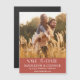 Um moderno salve a data em um formato de cartão magnético exclusivo projetado para acomodar sua foto favorita de noivado. "Salve a data" aparece no fundo da sua foto em caracteres brancos e escrita, com seus nomes, data de casamento e local de casamento embaixo de um fundo terra cotta. Use a linha de texto adicional para compartilhar seu site de casamento ou detalhes adicionais.