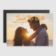 Anuncie seu grande dia com este Cartão de Save the Date com Foto Personalizada, apresentando uma foto romântica do pôr do sol na praia tropical do casal feliz. Os nomes 'EMILI & DANIEL' e a data '09.21.XX' são impressos ao lado da imagem principal. Uma fonte de letra cursiva laranja vibrante exibe 'Save The Date' acima dos detalhes pessoais. Este cartão plano de alta qualidade inclui um envelope branco correspondente, facilitando o envio de uma bela prévia da celebração do seu casamento para amigos e familiares.