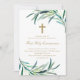A aquarela botânica do eucalipto sai com a cruz, religiosa, convite para o anúncio da foto da Primeira Comunhão.