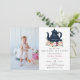 Convite de aniversário com bule azul marinho e flores. Personalize com sua foto. Personalize com suas informações ou clique em "clique para personalizar mais" para ajustar o tipo de fonte, o tamanho e a cor.