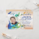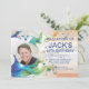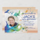 Ripplos de fluido fluido através do convite, constituídos por azuis e verduras, e virando para esticado e cinzento. Uma janela circular de fotos fica no centro. Adequado para qualquer idade.