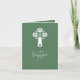 Um convite a fotos verde-férn com uma cruz floral branca para batizar ou batismo. Personalize o convite com a foto, o nome, o local e os detalhes de contato do seu bebê, e mude o batismo, se preferir. Parte da Coleção Floral Cross Christening.