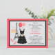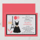Convite chique e moderno do aniversário com um tema francês. Caracteriza bolinhas pretas vestem-se, um par de calçados do salto alto, uma bolsa e dois balões com a torre Eiffel no fundo. Uma borda do scallop termina este cartão atraente. Excelente para uma mulher ou um adulto novo que seja forma amigável, energética e dos amores. Olhar parisiense com uma paleta de cores brilhante. Pode ser usado para todo o aniversário. Adicione seu próprio fraseio.