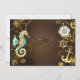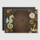 Fundo de madeira castanho com fundo marinho, cordilheira mecânica, volante antigo, âncora de ouro e diversas engrenagens de ouro e latão. Estilo Steampunk.