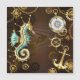 Fundo de madeira castanho com fundo marinho, cordilheira mecânica, volante antigo, âncora de ouro e diversas engrenagens de ouro e latão. Estilo Steampunk.