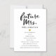 Este chá de panela moderno apresenta as palavras "futura Sra." em um roteiro manuscrito preto com um campo de texto personalizável embaixo para a noiva ser o futuro sobrenome. Um coração de ouro falso senta-se por baixo, logo acima dos detalhes do chá de panela. O fundo pode ser alterado para qualquer cor.