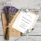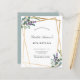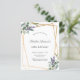 Um fundo branco na moda na frente. Decorado com eucalipto e lavandas florais. Um quadro geométrico dourado. Personalize e adicione um nome e detalhes. Fundo: fundo colorido de cinza verde.