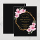 Um convite de aniversário floral tropical 50º (ou qualquer idade) com flores de hibisco cor-de-rosa, verde e uma estrutura geométrica falsa de ouro. Fundo negro elegante. Modelos para um nome escrito com um script de estilo manuscrito moderno, modelos para suas informações de partido. Texto preto. Perfeito para uma festa de verão, piscina ou praia! Traseiro: cor preta do fundo. Dica: Se você não quiser que pareça um cartão postal, clique em personalizar, vá para o verso e remova o divisor e o carimbo de posto.