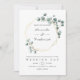 Trendy watercolor eucalipto, convite para casamento de prata com moldura geométrica dourada.