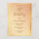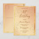 Convite de aniversário de 18 anos elegante e glamoroso. Cor de fundo ombre dourado e rose gold chique com uma moldura simples e fina em dourado falso. Decorado com bolhas de champanhe festivas e um par de taças de champanhe. Letras douradas escuras. O título: Aniversário de 18 anos e o nome é escrito com letras manuscritas modernas.