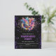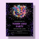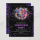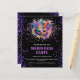 Convite personalizável do partido Mardi Gras. Apresentando uma máscara de mascarada Mardi Gras colorida e impressão de brilho falso em um fundo preto.