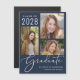 Marinho azul de cartão magnético mantendo o anúncio de graduação de foto apresentando uma colagem de 3 fotos e um "Formando" em um roteiro elegante branco. Adicione o nome do formando, ano de aula e escola ou universidade na tipografia branca moderna.