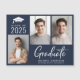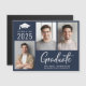 Cartão de anúncio magnético azul escuro de graduação moderna com 3 fotos e "Formando" em um roteiro branco contemporâneo ousado. Adicione o nome do formando, ano de aula e segundo grau ou faculdade em tipografia branca simples.