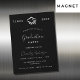 Um cartão magnético moderno e elegante de convite à festa de formatura. Um fundo preto, texto branco. Personalize e adicione um nome, ano e detalhes.