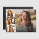 Cartão magnético de anúncio de graduação elegante com a foto do formando sobreposta com uma faixa de três fotos quadradas menores e "Formando" em um roteiro branco moderno e seu nome e ano de aula em uma tipografia branca simples.