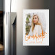 Íman de anúncio de graduação de tendências que apresenta o dentro de foto do formando de um quadro de máscara texturizado com "Formando" em um script manuscrito laranja. Personalize a frente dos anúncios de graduação de fotos adicionando o nome do formando, o nome da escola e o ano de graduação.