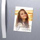 Este cartão de anúncio magnético de graduação em na moda apresenta sua foto favorita com "Formando" colocado no topo em um roteiro elegante. Adicione seu nome, escola e ano de aula.