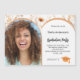 Adicione sua própria foto vertical do formando. Um quadro fotográfico colorido cor de pêssego escuro. Uma cor branca de fundo. Decorado com flores silvestres em pêssego e bege. Personalize e adicione um nome e detalhes da parte.