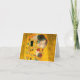 Cartão com pintura a óleo de Gustav Klimt com folha de ouro The Kiss (1908). Um homem e uma mulher, vestindo cores ouros brilhantes, adoravelmente abraçando e beijando num campo de flores. Um presente de excelente para fãs de Arte Nouveau e de Arte Austríaca.