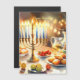 Ilustração de aquarela de Hanukkah. Uma mesa bem arrumada para uma comemoração festiva, com uma menorah tradicional com velas iluminadas. Luz suave e quente, enquanto decorações de férias adicionam um toque de alegria. Luzes quentes criando uma atmosfera acolhedora e convidativa.